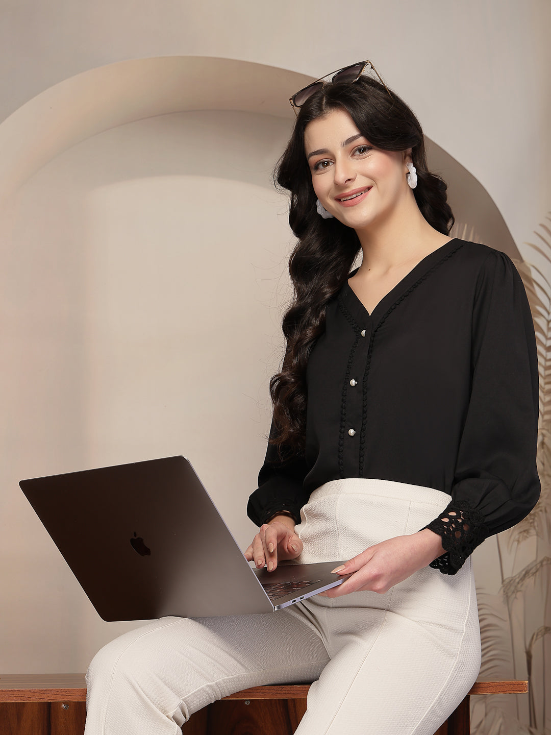 Crafted from v-neckline which enhances femininity while the full bishop sleeves add a touch of romance to any ensemble.Delicate lace detailing adorns the neckline and sleeve hems, infusing the garment with a hint of vintage allure.