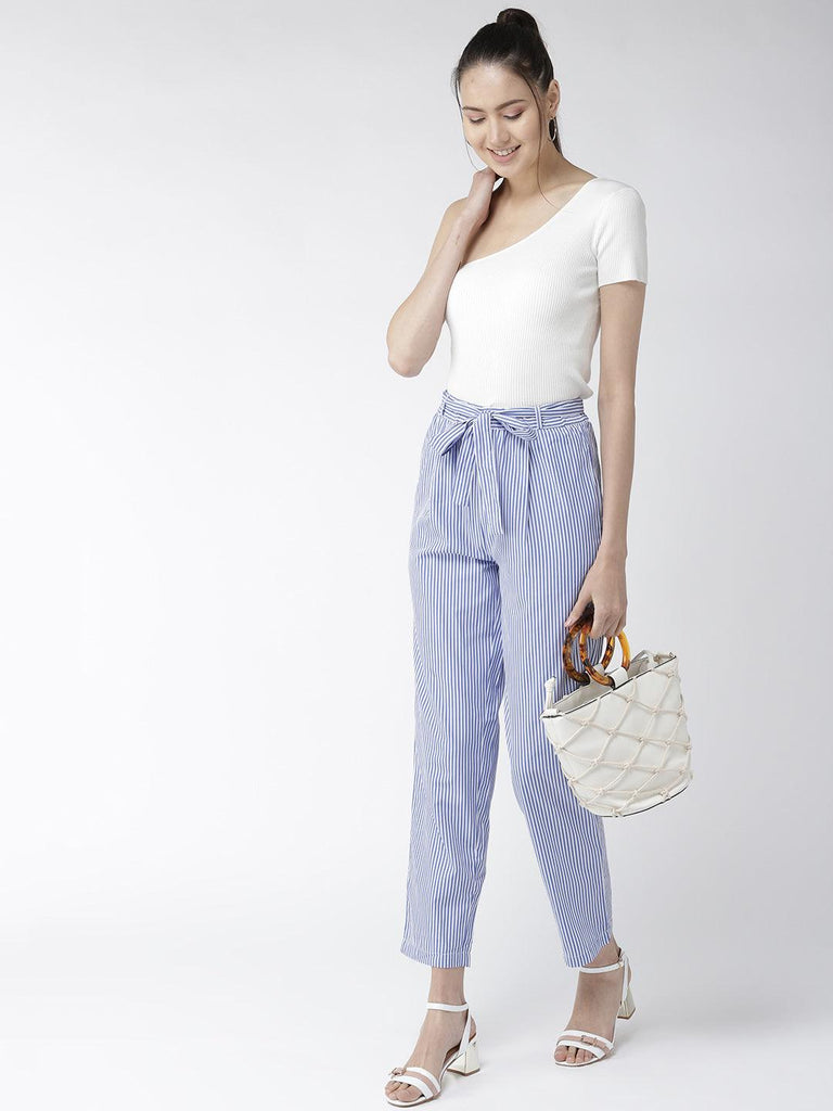 Blue And White Striped High-Rise Pleated Cropped Trousers, Has A Slip-On Closure, And 2 Pockets Comes With A Fabric Belt