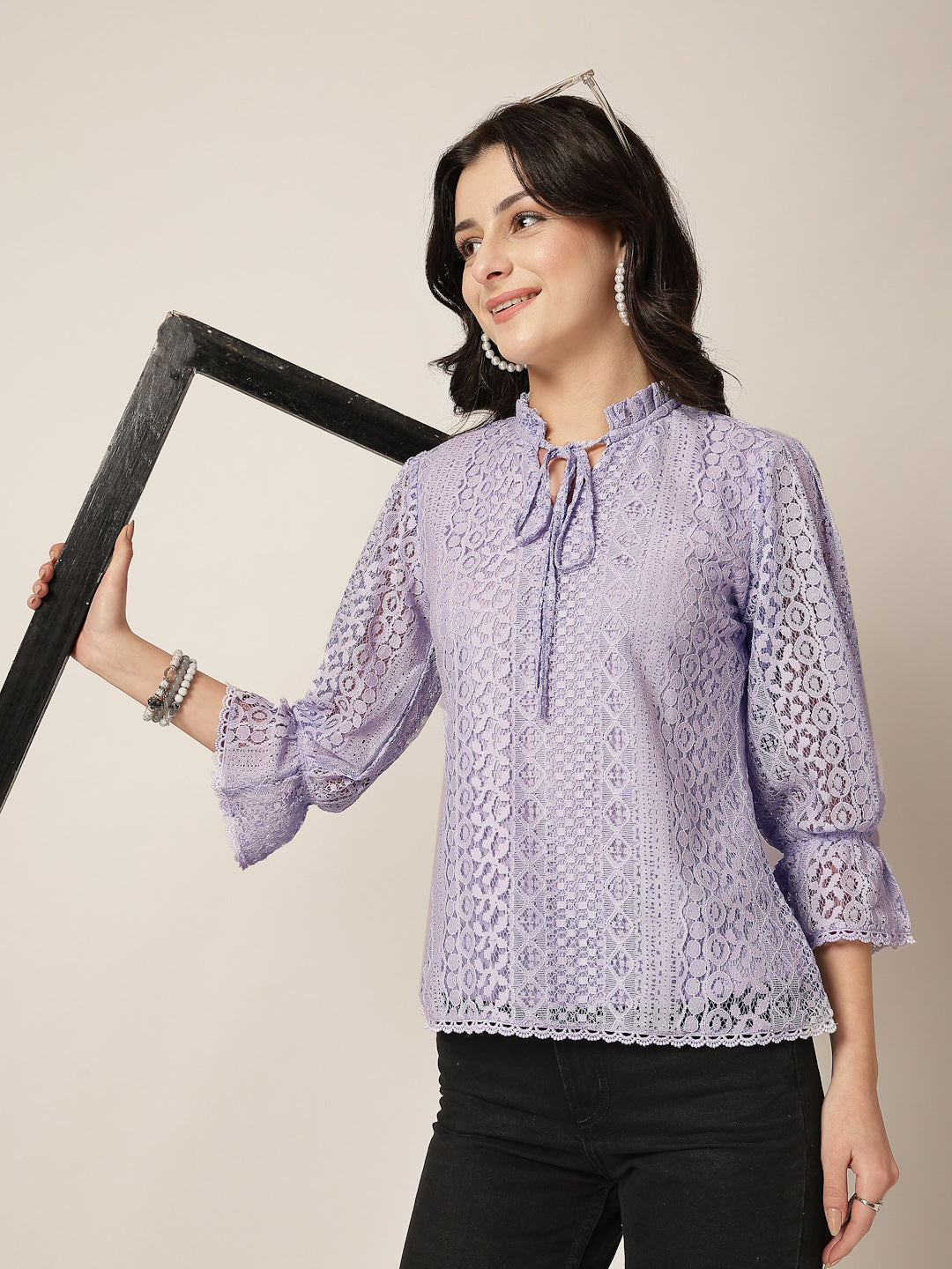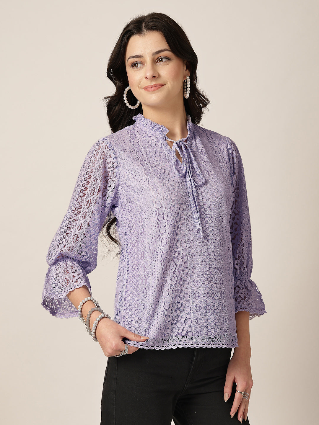 Look smart wearing this neck tie-up lace top with 3/4 puff sleeves. Pair with fitted pants for office with subtle jwellery and heels. Pair with denim and sandals during downtime and be sure to turn all heads