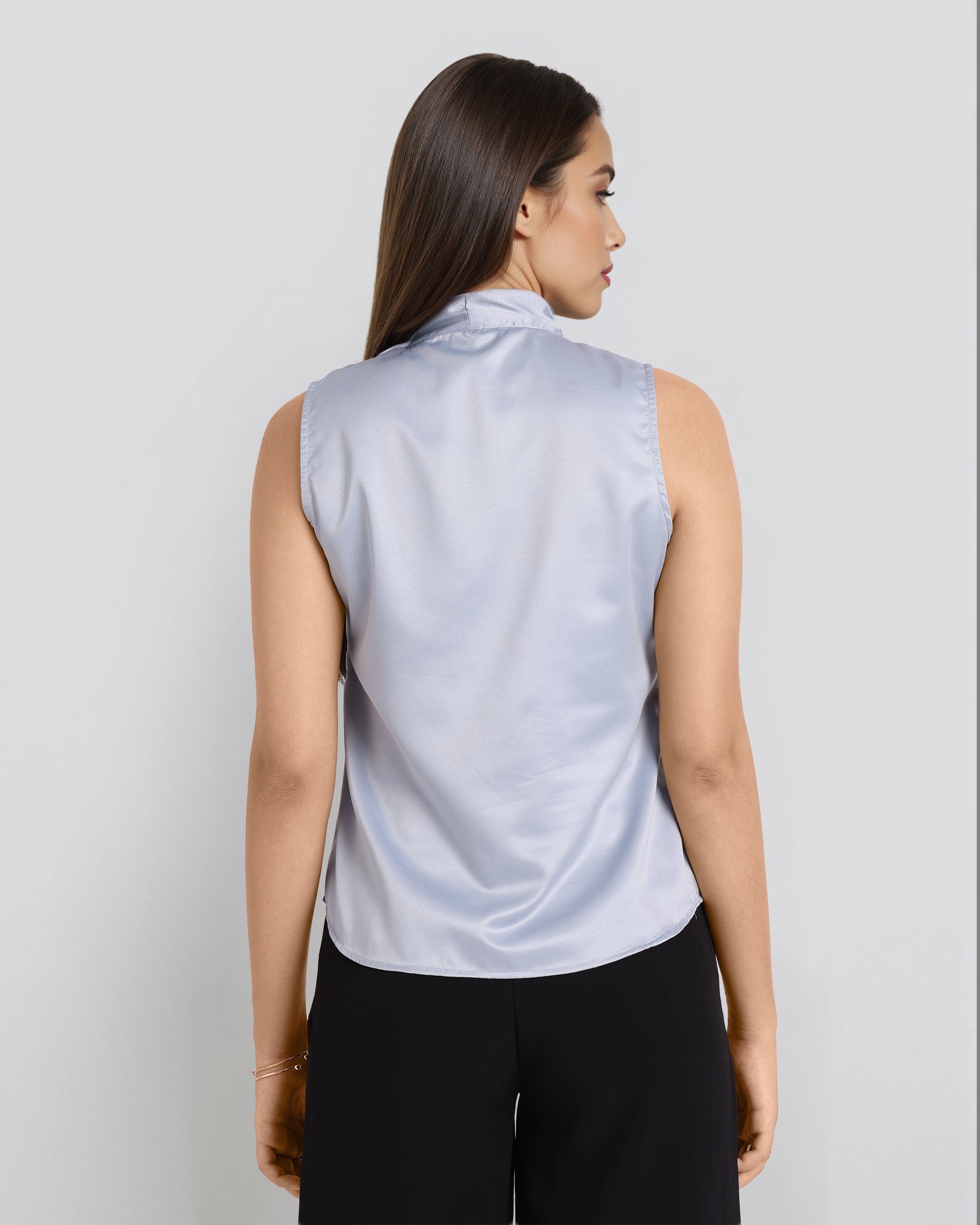 Solid satin sleeveless top with tie up neck and curved bottom hemline
